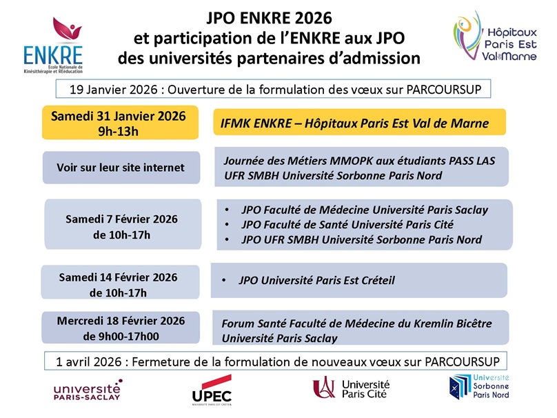 L’ENKRE sera présente aux JPO de ses universités partenaires de sélection le samedi 7 février 2026 Université Paris Saclay, Paris Cité et Sorbonne Paris Nord, le samedi 14 février 2026 Université Paris Est Créteil et aux forums Santé de la faculté de Médecine de l’Université Paris Saclay Site Kremlin Bicêtre le mercredi 18 février 2026 et des métiers MMOPK pour les étudiants PASS LAS de l’Université Sorbonne Paris Nord.