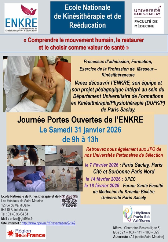 L’ENKRE sera présente aux JPO de ses universités partenaires de sélection le samedi 7 février 2026 Université Paris Saclay, Paris Cité et Sorbonne Paris Nord, le samedi 14 février 2026 Université Paris Est Créteil et aux forums Santé de la faculté de Médecine de l’Université Paris Saclay Site Kremlin Bicêtre le mercredi 18 février 2026 et à la journée des métiers MMOPK pour les étudiants PASS LAS de l’Université Sorbonne Paris Nord.