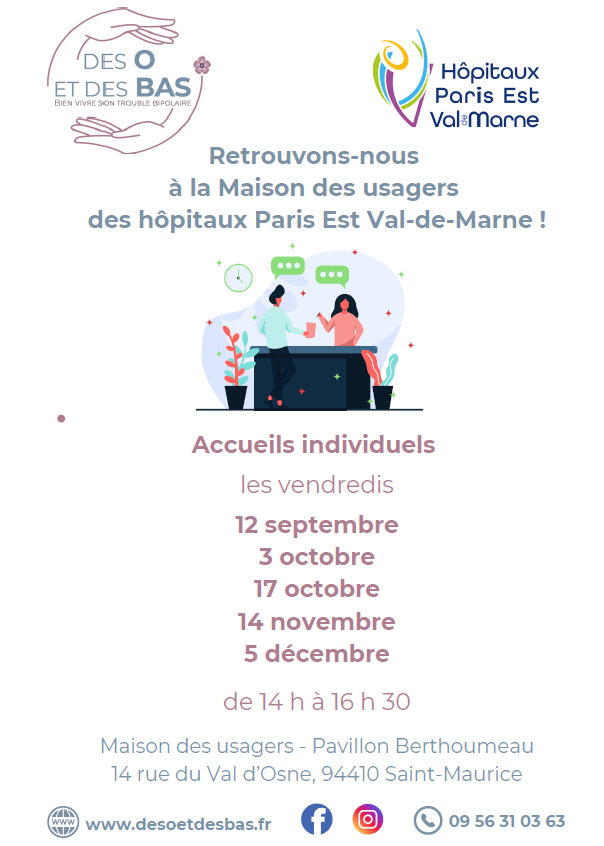 L’Association Des O et Des Bas, spécialisée dans l’accompagnement des personnes vivant avec des troubles bipolaires, poursuit ses actions à la Maison des Usagers des Hôpitaux Paris Est Val-de-Marne.